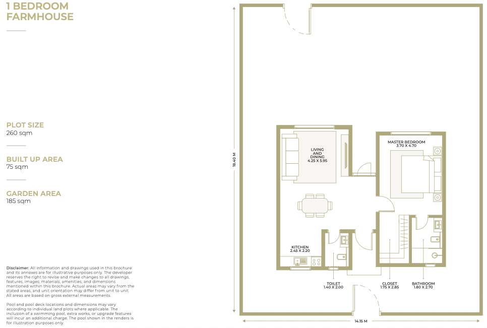 | 1 Bedroom Farmhouse | 260 sqm | 75 sqm | 185 sqm |