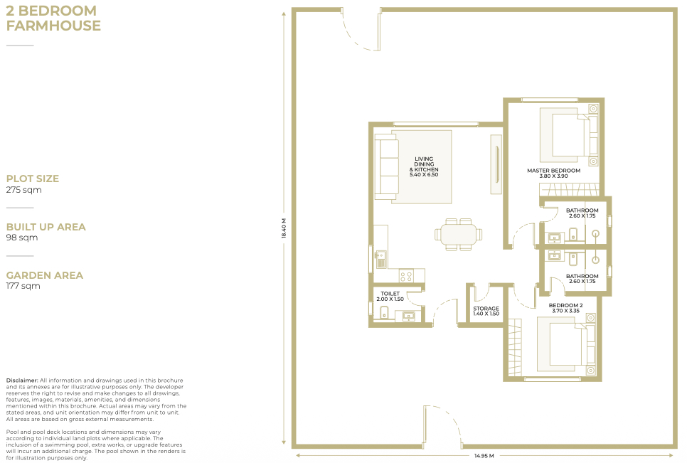 | 2 Bedroom Farmhouse | 275 sqm | 98 sqm | 177 sqm |