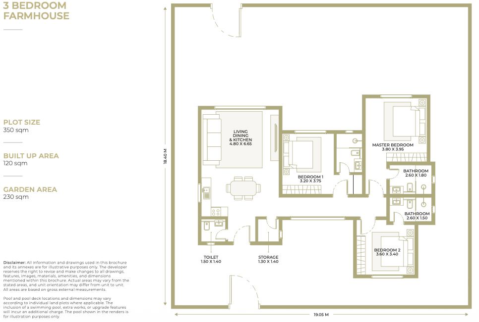 | 3 Bedroom Farmhouse | 350 sqm | 120 sqm | 230 sqm |