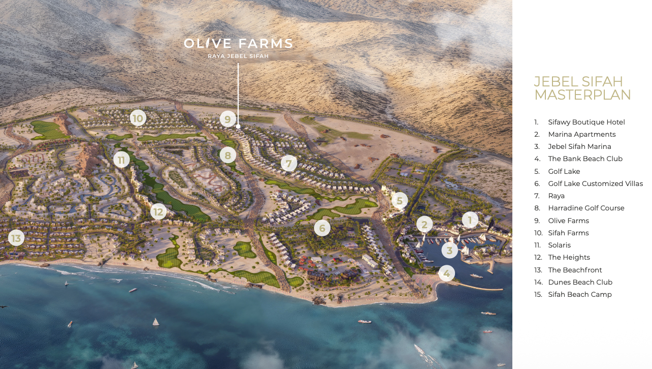 Oman’s first freehold farmhouse villa community inside a beachfront resort. Just 45 minutes from Muscat, Olive Farms is a limited release of fully detached farmhouse villas with private land, generous gardens and a choice of three design styles — set within the established coastal destination of Jebel Sifah.