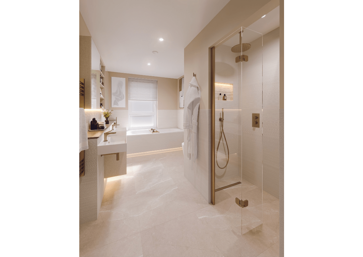 Luxurious bathrooms with brushed gold brassware, LED feature lighting, and double-ended bathtubs